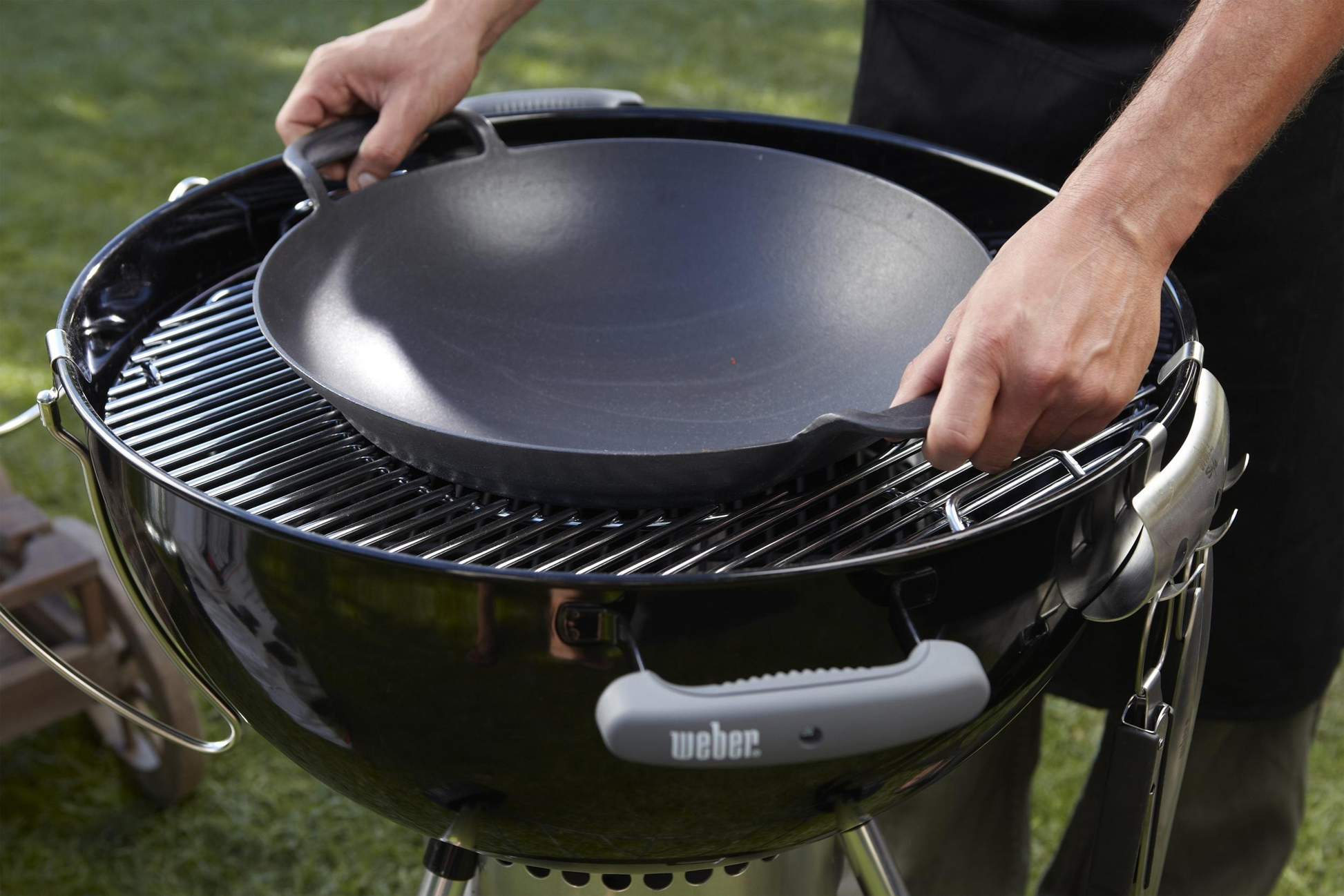 El wok Weber es un recipiente profundo de hierro fundido vitrificado, diseñado para usarse directamente sobre parrillas Weber compatibles. Su forma cóncava y su material permiten alcanzar altas temperaturas rápidamente, ideales para saltear, freír o reducir salsas con un sabor ahumado característico.